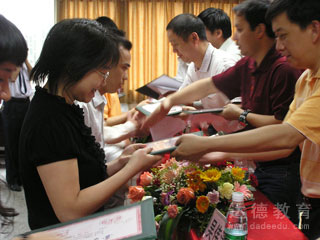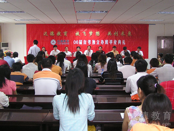 五月二十日上午外面下着绵绵细雨,佛山达德学校三楼的多媒体室却喜气洋洋。 2006 届第二批优秀毕业生毕业典礼正在隆重举行。出席本次毕业典礼的有广东省教育考试院自考办副主任黄列波先生、中山大学高等继续教育学院副院长刘正锡先生,达德教育集团董事长(北京达德教育研究院院长)李晓珍先生,还有省教育考试院、中山大学、佛山市区等各级教育部门和佛山达德学校的领导、嘉宾及二百五十六位毕业生。