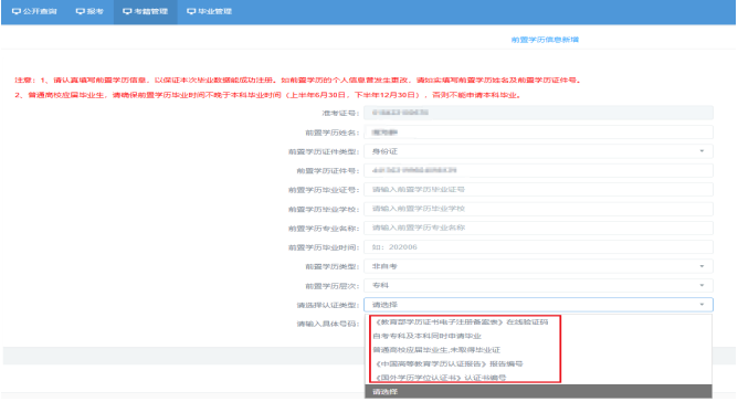 5.申请上半年自考本科毕业的普通高校全日制应届毕业生,在登记前置学历信息时,如未取得前置学历毕业证,可暂不填写前置学历毕业证号及学历认证信息;取得毕业证后,须于7月3日前登录系统补填前置学历毕业证号及认证信息,提交省考办核查。未按时补填的,视为放弃本批次毕业申请。