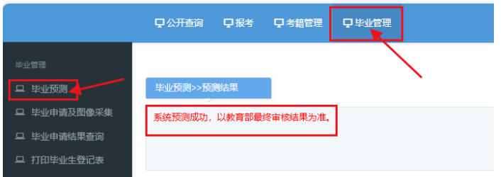 4.未办理过该专业的毕业证书。 (1-3各科成绩合格后登录系统在“毕业管理”模块进行毕业预测,如预测结果显示“系统预测成功,以教育部最终审核结果为准”,可在6月或12月进行毕业申请。)